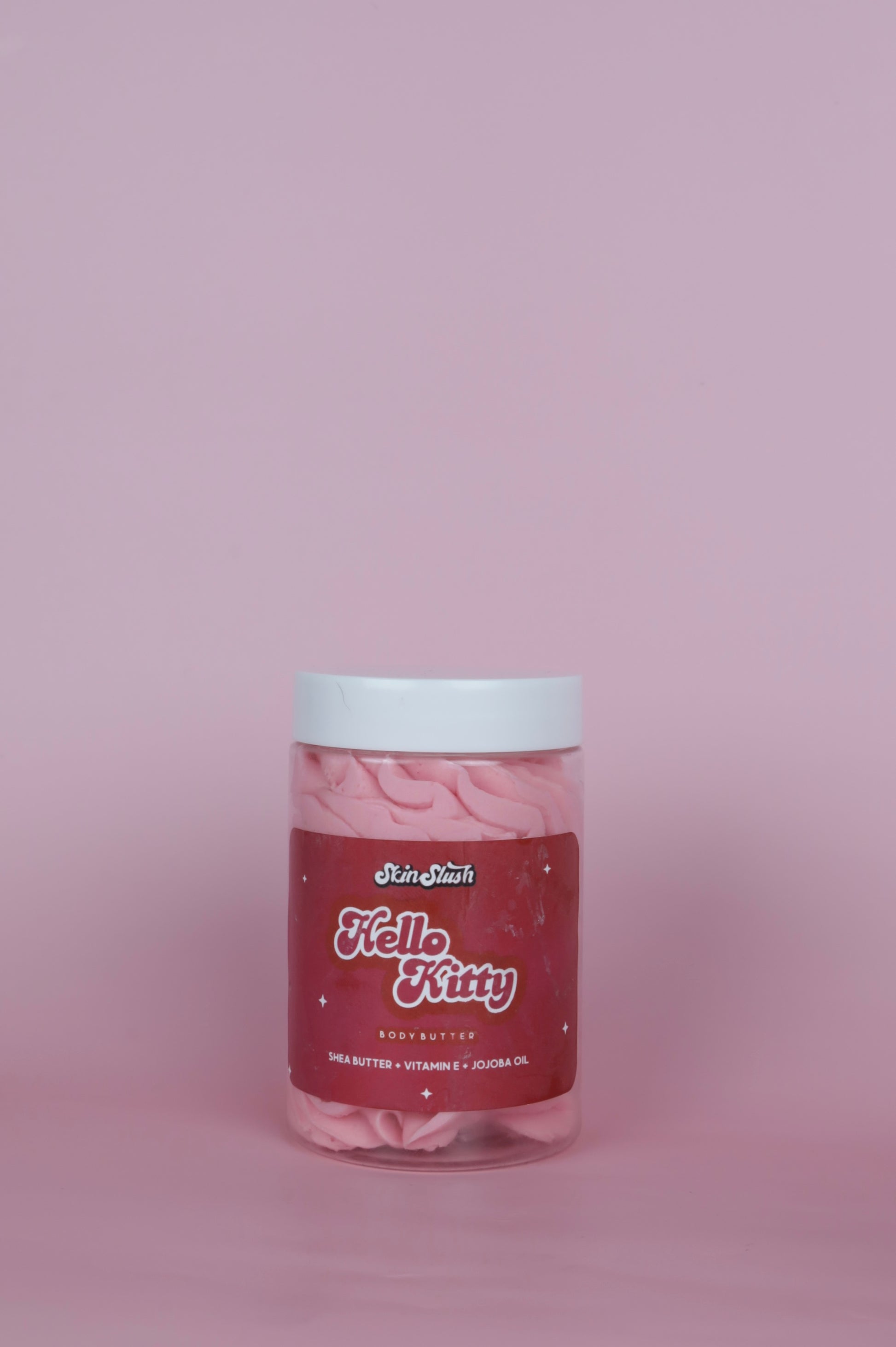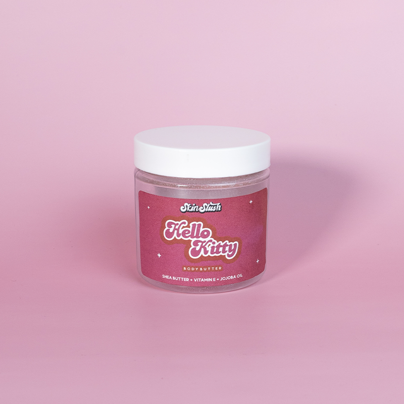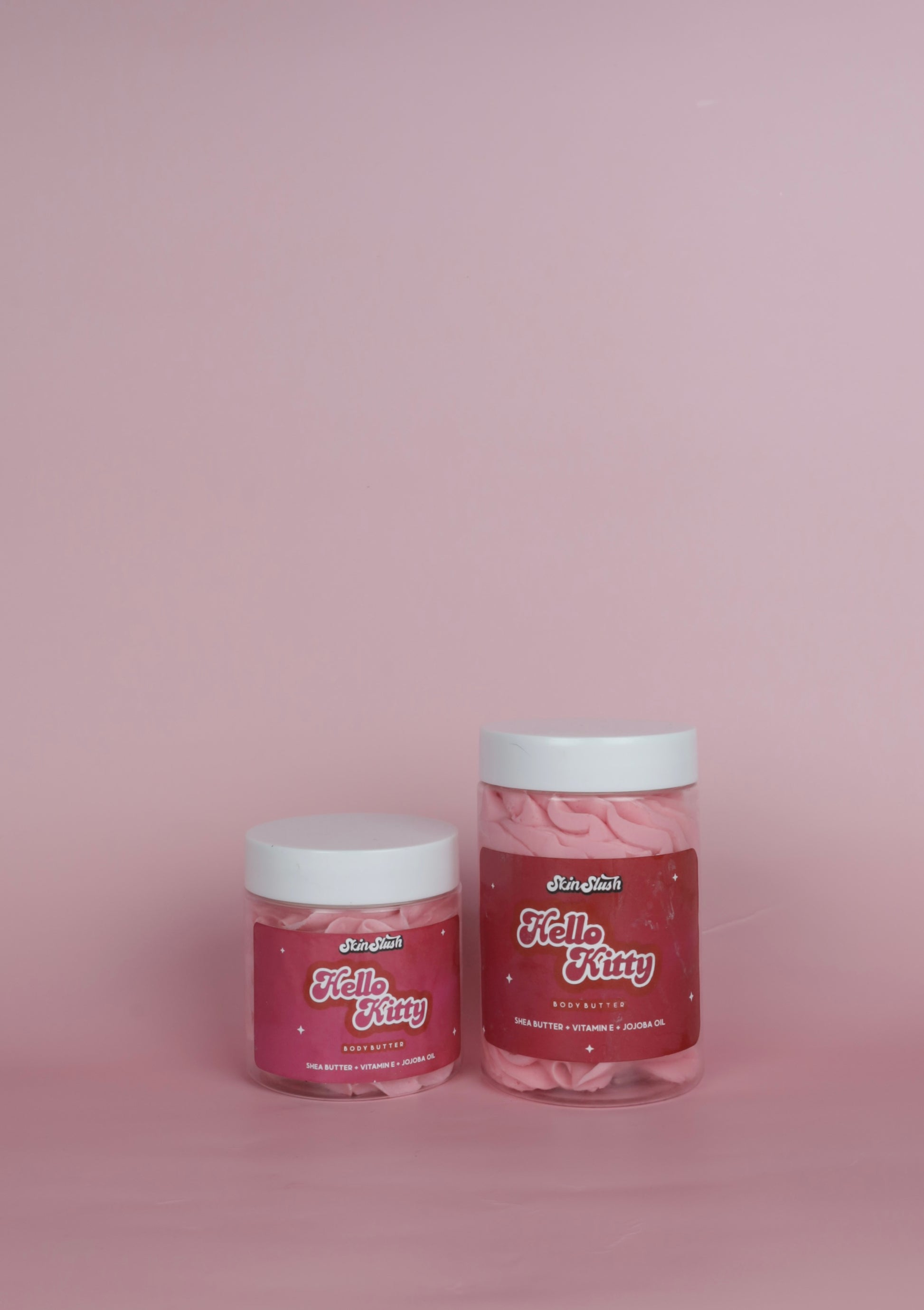 Step into a world of bliss with Hello Kitty Body Butter. This sweet juicy sugared strawberry scented body butter is the perfect addition to your bath and skin care routine. Packed with natural butters like Shea Butter and Kokum butter, Hello Kitty is perfect for anyone suffering from dry skin conditions or feeling especially parched. Bodly vegan yet pink and friendly, “Hello Kitty” keeps youre skin hydrated, soft and nourished. With its creamy texture, Hello Kitty easily absorbs into the skin- encouraging even coverage pf moisture throughout the day. So put away that little bottle of lotion for good; try Hello Kitty today and transform your skin care routine.
